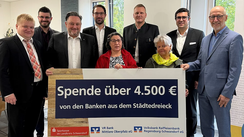 Die Mitarbeiterinnen der Tafel im Städtedreieck nahmen den Scheck freudig entgegen und bedankten sich persönlich bei den Bankvorständen Mathias Semmelmann (Volksbank-Raiffeisenbank Regensburg-Schwandorf eG), Sebastian Gehmacher (VR Bank Mittlere Oberpfalz eG) und Tobias Eckl (Sparkasse im Landkreis Schwandorf) für die erneute finanzielle Beteiligung.