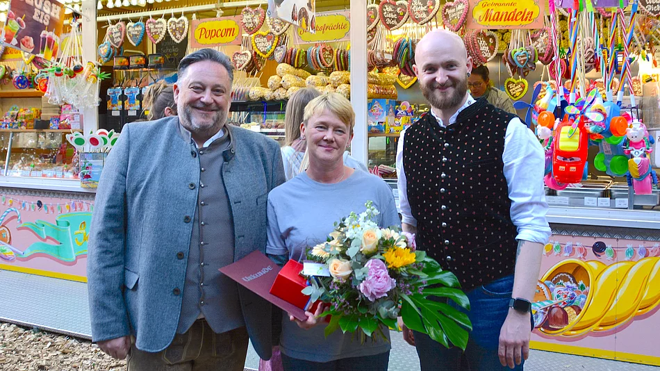 Zum 25-jährigen Jubiläum dankte Bürgermeister Thomas Beer der langjährigen Schaustellerin persönlich für ihre Treue und ihren unermüdlichen Einsatz. Im Namen der Stadt überreichte er eine Ehrenurkunde, ein Präsent sowie einen Blumenstrauß – als kleines Zeichen der großen Wertschätzung und der äußerst guten geschäftlichen Beziehungen.