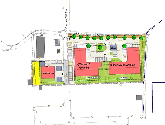 Losgehen kann es, nach dem erfolgten Spatenstich, nun aber mit dem Bau der vorgesehenen Gebäude. Demnach entsteht zunächst im östlichen Teil des Grundstücks (näher am Stadtpark gelegen), das Senioren-Servicehaus (Haus B). Mit einem kleinen zeitlichen Versatz erfolgt der Bau des Wohn- und Geschäftshauses (Haus A), welches direkt an der Dr.-Fr.-Flick-Straße (westlicher Teil) liegen wird. Baubeginn hierfür ist nach Zugang des Förderbescheids. Ein dreigeschossiges Mehrfamilienhaus mit mehreren Wohneinheiten, wird auf einem Teilgelände des aktuellen Recyclinghofs auf der gegenüberliegenden Straßenseite entstehen. Hier kann mit den Arbeiten begonnen werden, sobald der neue Interkommunale Recyclinghof im Gebiet „Teublitz Süd-Ost“ in Betrieb gegangen ist.
