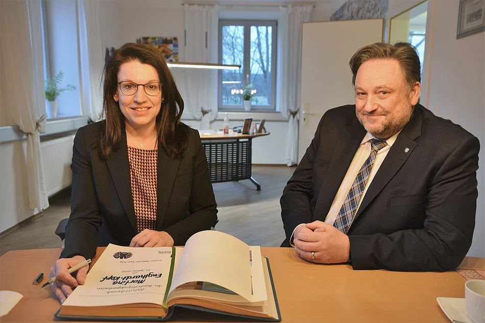 Beim gemeinsamen Dialog zwischen MdB Englhardt-Kopf und Bürgermeister Beer waren aktuelle Themen und Zukunftsprojekte, unter anderem die Umfahrungsstraße, der Sachstand zum Gewerbegebiet und die geplanten Maßnahmen der Stadt in 2022, Schwerpunkte des Gesprächs. Auch gab die Abgeordnete aktuelle Informationen aus dem Bundestag weiter und nahm Anregungen für Ihre Arbeit im Bundestag mit. Im Rahmen des Antrittsbesuchs trug sich die Abgeordnete noch in das Goldene Buch der Stadt Teublitz ein. Im Zuge dessen sicherte sie Bürgermeister Thomas Beer ihre Unterstützung zu. Zugleich freue sie sich darauf, ihren Wahlkreis zukunftsfähig zu machen und die Themen der Bürger*innen in die politischen Entscheidungsprozesse auf Bundesebene mit einzubringen.