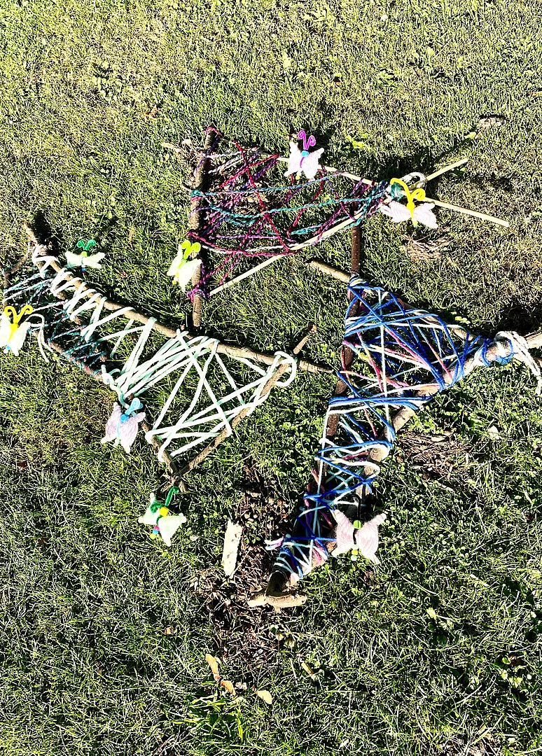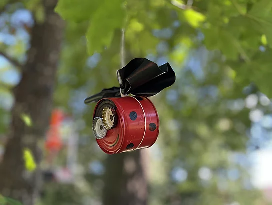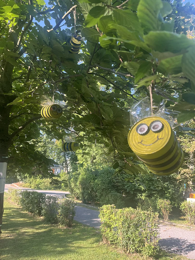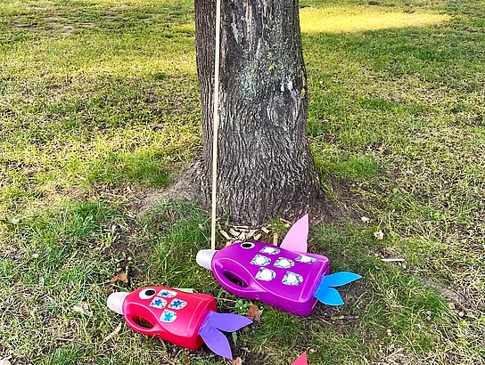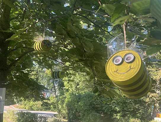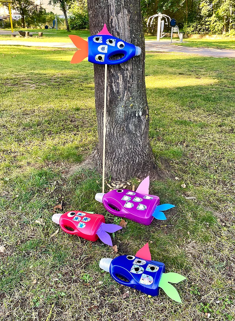 Die Kinder, mit kleinen Hilfestellungen Erwachsener, haben dabei ihrer Kreativität freien Lauf gelassen. Aus Recyclingmaterialien wurden wundervolle und individuelle Kunstwerke geschaffen. Zu den Dekorationen gehören Fische aus Waschmittelflaschen, Insekten aus Dosen, gewebte Traumfänger, Schmetterlinge aus Perlen und Wolle und viele weitere fantasievolle Anhänger. Nach der Montage durch die Mitarbeiter des städtischen Bauhofs können die Kunstwerke ab sofort bewundert werden.