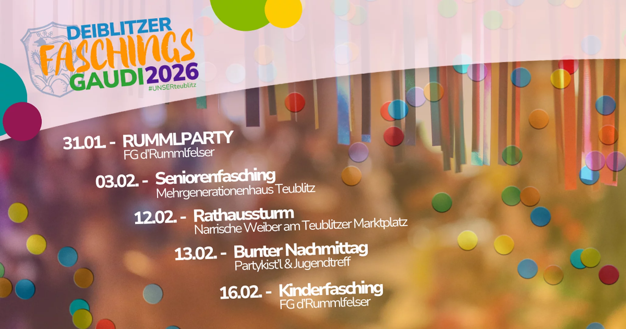 Dass Teublitz ausgelassen feiern kann, ist längst bekannt. Auch im Jahr 2026 dürfen sich die Faschingsfreunde wieder auf die „Deiblitzer Faschingsgaudi“ freuen. In bewährter Zusammenarbeit mit der Faschingsgesellschaft „d’Rummlfelser“, den Teublitzer „Narrischen Weibern“, dem städtischen Seniorenbeirat sowie dem Jugendtreff erwartet die Besucher ein buntes und abwechslungsreiches Programm.