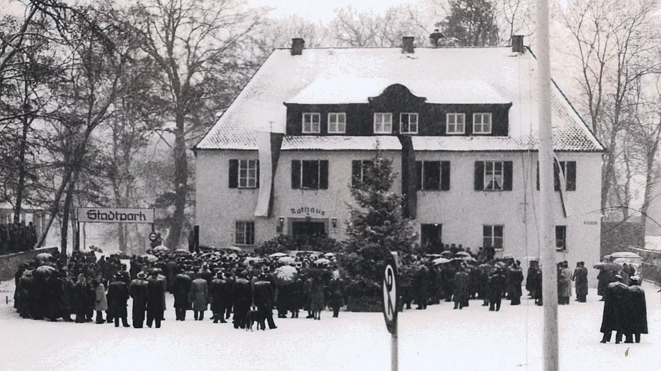 Das Foto zeigt ein verschneites Rathaus mit Marktplatz sowie einem Christbaum und einer großen Anzahl von Menschen, die trotz des schlechten Wetters gekommen waren, um Karl Franke daheim zu begrüßen. Da die Entfernung vom Weihnachtsbaum zu groß war und die Aufnahme schwarz-weiß, kann natürlich hier keine rote Kerze erkannt werden, die aber damals anscheinend bereits verwendet wurde. Das Foto verdeutlicht jedoch, dass bereits 1954 am Platz der Freiheit in der Weihnachtszeit ein Christbaum den Marktplatz schmückte.