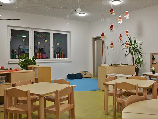 Im Erdgeschoss sind drei Gruppenräume mit jeweils einem Lagerraum, drei Nebenräumen, Büro, WC-Anlagen, Küche, Hauswirtschaftsraum, und drei Ruheräume auf einer Fläche von rund 680 qm.