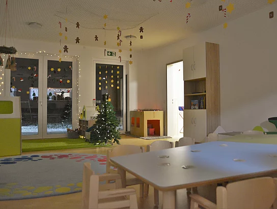 Die Außenanlage für Kleinkinder umfasst eine Spielfläche von rund 420 qm mit Kleinkinderkombination „Blätterland“ mit Kriechröhre, Rutsche, Kleinkinderschaukel. Für Kindergartenkinder sind rund 620 qm Spielfläche mit der Spielkombination „Adria“ inklusive Spielturm, Hängebrücke, Kletterturm, Rutsche, Schaukel und einem Sandkasten mit Abdeckung und Sonnenschutz vorhanden.