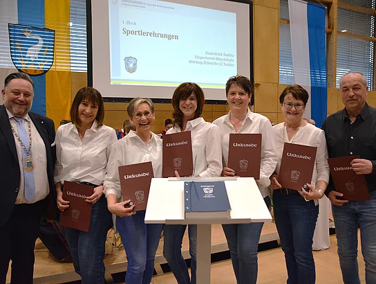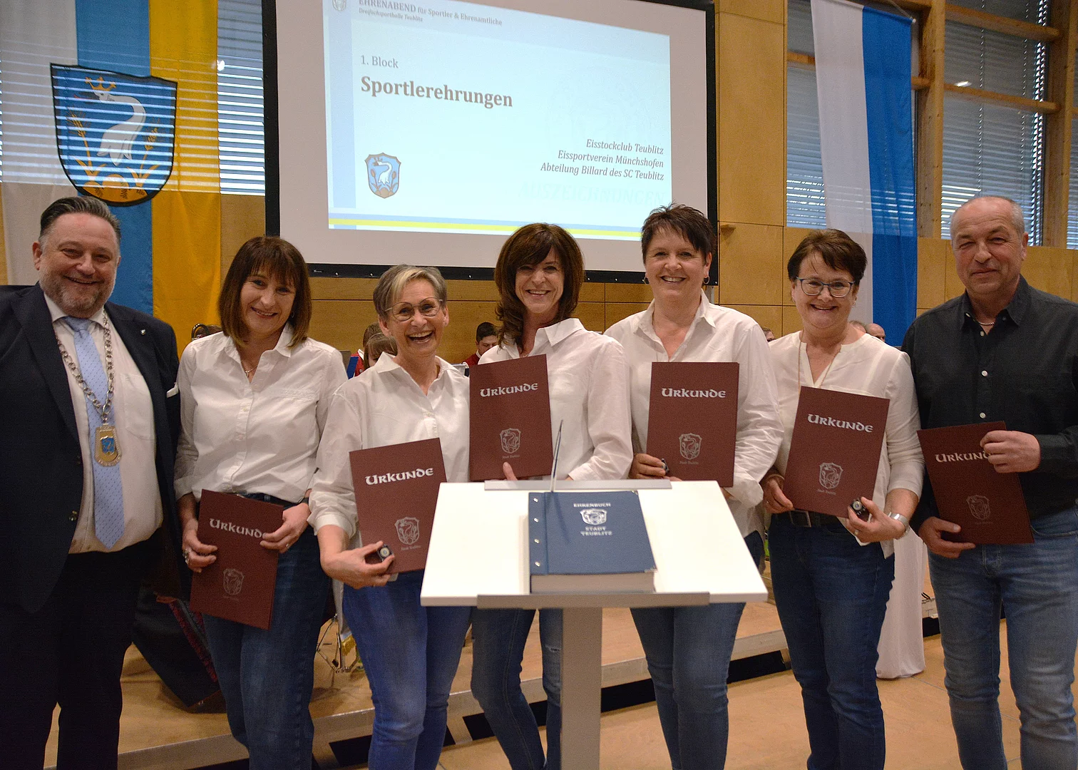 Urkunde: Sabine Klafta, Ehrennadel in Bronze: Andrea Ernst, Kerstin Albrecht, Luise Freymuth, alle ESC Teublitz Meister Bezirksliga-Stockschießen; Urkunde: Franz Binder, Stephan Feicht, Johann Merl, Peter Zitzler, alle ESC Teublitz Meister Kreisoberliga-Stockschießen; Ehrennadel in Silber: Marion Baringer, Sibylle Beer, Brigitte Forster, Sylvia Röhrl, Renate Schlagenhaufer und Kerstin Roth, alle EV Münchshofen 2. Deutsche Meister und Bayernpokalsieger Ü-50; Ehrennadel in Silber: Manuel Hübscher, Sebastian Hofmann, Thomas Karl, Urkunde: Alexander Kraus, alle SCT-Abteilung Billard, Bezirksmeister; Urkunde: Katharia Greh, Bootscooters e.V., Deutsche Meisterin Linedance Classic; Ehrennadel in Silber: Markus Hintermeier, Rassegeflügelzuchtverein, Bayer.Meister mit Niedeländischen Schönheitsbrieftaube; Urkunde: Johann Weiler, Rassegeflügelzuchterein, Bayericher Meister mit Deutscher Schautaube; Ehrennadel in Silber: Inge Haas, Schäferhundeverein Saltendorf, Vizesiegerin Hundesport; Ehrennadel in Silber: Alina Bitterbier, Schützen Almenrausch Katzdorf, Bayerische Meisterin Luftgewehr Schüler; Ehrennadel in Bronze: Jonas Kellner, TV Burglengenfeld, Oberpfalzmeister-Leichtathletik; Urkunde: Lars Ruhland, TV Burglengenfeld, Bayerischer Meister 3. Platz, Triathlon-Sprintdistanz; Ehrennadel in Silber: Justine Jendro, TV Burglengenfeld, Deutsche Meisterin 3. Platz in Triathlon Mitteldistanz; Ehrennadel in Bronze: Julian Besenhardt, TV Burglengenfeld, Kreismeister-Leichtathletik 4-Kampf; Urkunde: Paula Rothballer, TV Burglengenfeld, Kreismeisterin Leichtathletik 4-Kampf.