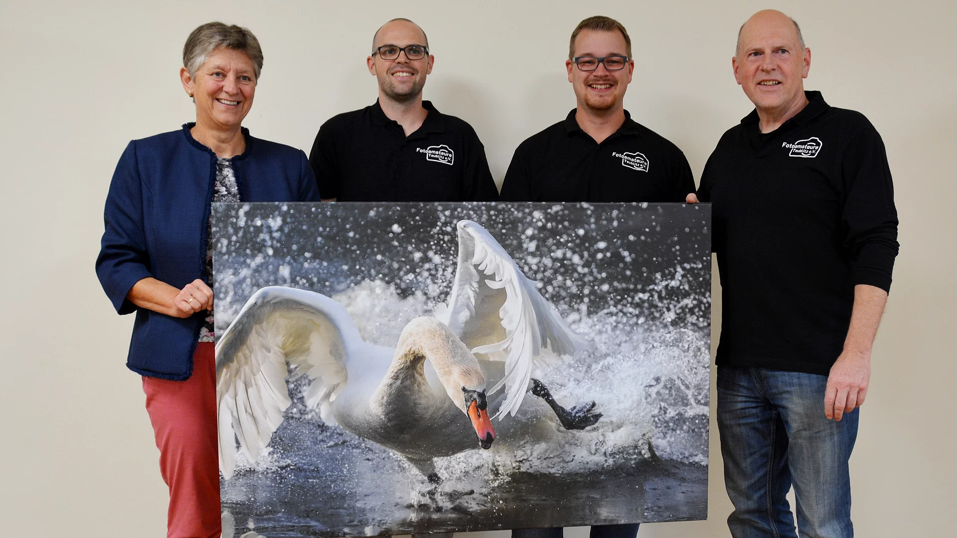 Als besonderes Schmankerl überreichten die Fotoamateure außerdem eine große Leinwand mit einem kämpfenden Schwan als Geschenk an die Stadt an Bürgermeisterin Maria Steger. Die spektakuläre Aufnahme war Fotograf Hans Zitzler an einem Weiher bei Teublitz gelungen und nachdem der Schwan passenderweise das Wappentier der Stadt Teublitz ist, darf sie nun das städtische Mehrgenerationenhaus verschönern.