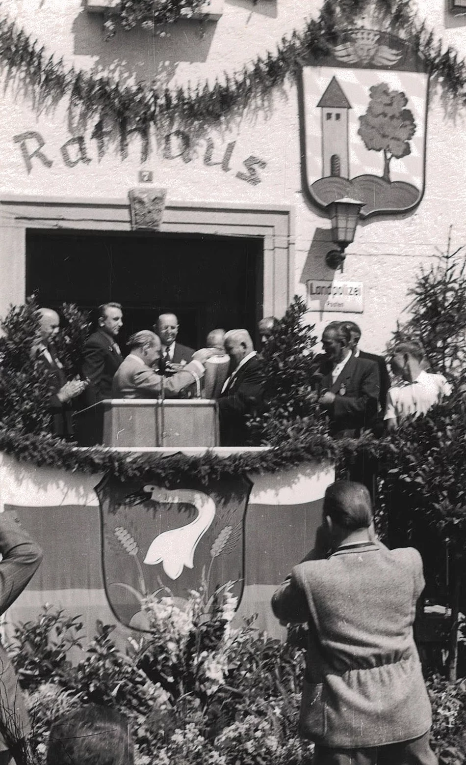 Tatsächlich hätte ein kurzer Blick auf den fraglichen Gegenstand genügt, um derartige Missverständnisse aufzuklären. Am unteren Rand des Objekts befindet sich die Gravur: „Der Stadt Teublitz am 9. August 1953 von der Kreissparkasse Burglengenfeld“. Es handelt sich demnach um ein Geschenk zur Stadterhebung vor 68 Jahren. Im Stadtarchiv liegt dazu noch ein Foto vor. Landrat Dr. Haschke überreichte bei der Stadterhebungsfeier genau diese Vase im Auftrag der Sparkasse. Die Stadt Teublitz wird die Vase in Ehren halten. Immerhin jährt sich im Jahr 2023 die Stadterhebung zum 70. Mal.