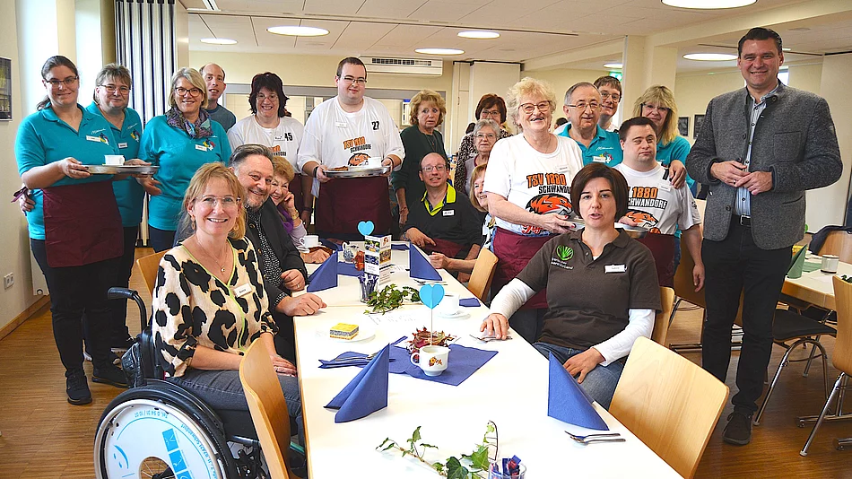 Die Tische waren in verschiedenen Farben eingedeckt. Nachdem die Gäste Platz genommen und sich ihre Tischfarbe gemerkt haben, konnten sie sich bei einer großen Auswahl an Kuchen und Torten entscheiden, die durch die „Landfrauen“ unter der Führung von Kreisbäuerin Sabine Schindler gesponsert wurden. Nach der Nennung der Tischfarbe ging es für die Gäste wieder zurück an ihre Plätze. Jeweils zwei Menschen mit „Handicap“ und einer ohne Einschränkungen brachten daraufhin die Speisen und Getränke an die jeweiligen Tische. Mitglieder der „Schwandorf Tigers“ und der „Gruppe Miteinander“ hatten sich dafür extra Schürzen umgebunden, um das Café-Haus-Gefühl zu unterstreichen.