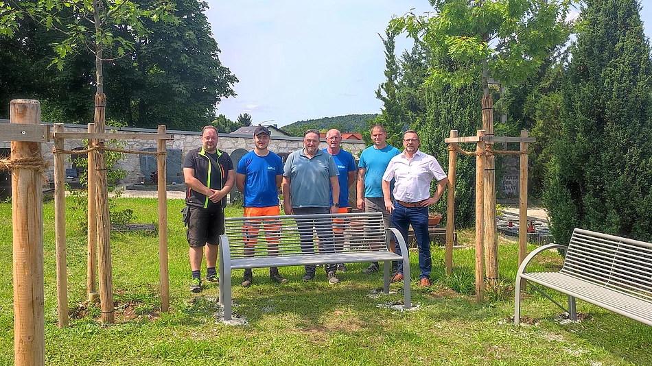 Insgesamt sechs Bäume sowie fünf neue Sitzbänke wurden im gesamten Friedhofsbereich integriert. Ein besonderer Fokus lag auf dem südwestlichen Teil des kirchlichen Friedhofs: Dort entstand auf einer freien Grünfläche ein sogenannter Meditationskreis – bestehend aus vier in karreeförmiger Anordnung gepflanzten Bäumen und drei Bänken. Dieser neue Bereich bietet Besucherinnen und Besuchern die Möglichkeit, innezuhalten, zur Ruhe zu kommen oder in stiller Gemeinschaft Zeit zu verbringen.