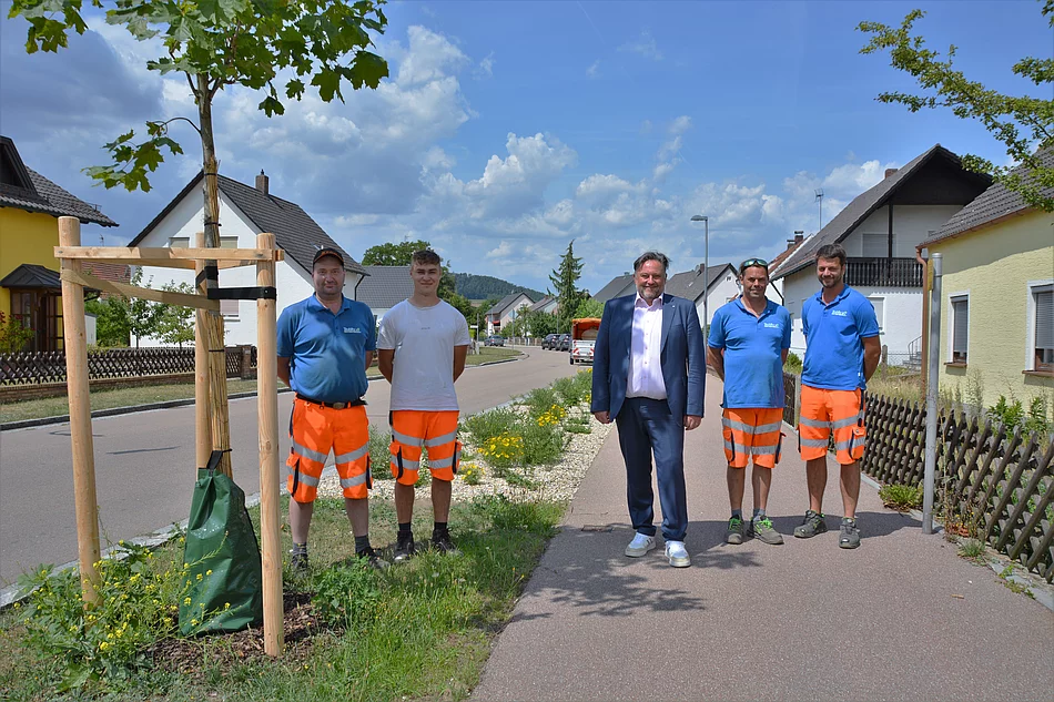 Ergänzend dazu wurden insgesamt vier neue Bäume der Art „Spitzahorn“ gepflanzt. Damit das Wurzelwerk sich an den neuen Standort gewöhnt, wurden zur leichteren Bewässerung aktuell Wassersäcke an die Stämme oberhalb des Wurzelwerks angebracht. Diese müssen vom Grünanlagen-Team des Bauhofs alle zwei Tage neu befüllt werden. Am Ende soll es ein ansprechenderes Ortsbild durch frisch gestaltete Grünanlagen in Teublitz geben.