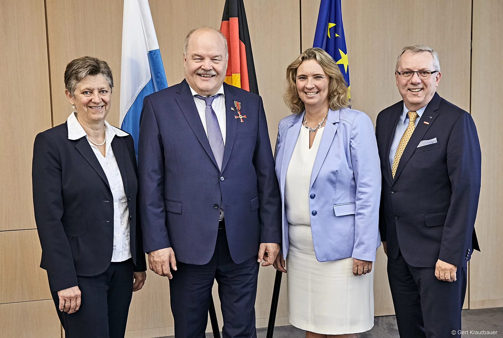Für sein vielfältiges und langjähriges Engagement, insbesondere in der Ausbildung dankte ihm die Ministerin für Familie, Arbeit und Soziales Kerstin Schreyer, als sie ihm im Bayerischen Staatsministerium für Finanzen das von Bundespräsident Frank-Walter Steinmeier verliehene Verdienstkreuz am Bande für jahrzehntelangen ehrenamtlichen Einsatz für die Interessen und Belange des Bayerischen Handwerks überreichte. Albert Vetterl war von 1978 bis 2014 Mitglied im Meisterprüfungsausschuss der Handwerkskammer Niederbayern-Oberpfalz und ist seit vielen Jahren Vorstandsmitglied der Vollversammlung der Handwerkskammer, Präsident des Bayerischen Kraftfahrzeuggewerbes und Landesinnungsmeister. „Sie machen sich für die Interessen und Belange dieser wichtigen Wirtschaftsbranche stark“ sagte Schreyer.