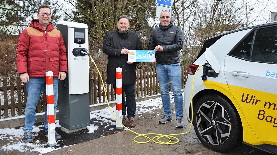 Damit wurde das Angebot an öffentlich zugänglichen Ladestationen für Elektro-Autos auf sieben Punkte ausgeweitet. Zu den insgesamt sieben Ladestationen zählen auch die bisher vorhandenen Stationen an den öffentlichen Parkplätzen hinter dem Rathaus und beim Friedhof in Teublitz. „Mit diesem flächendeckenden Angebot an öffentlichen Ladestationen sind wir als Stadt Teublitz in unserer Region ganz vorne mit dabei“, zeigte sich Thomas Beer überzeugt. Als Betreiber aller e-Auto-Ladestationen fungiert auch weiterhin Bayernwerk e-mobil. Wolfgang Dumm, Kommunalbetreuer der Bayernwerk Netz GmbH, ging mit Bürgermeister Thomas Beer und IT-Administrator Thomas Grundstein „auf Tour durch Teublitz“. Dabei machten sie sich ein Bild von den Ladestationen an den fünf neuen Standorten.