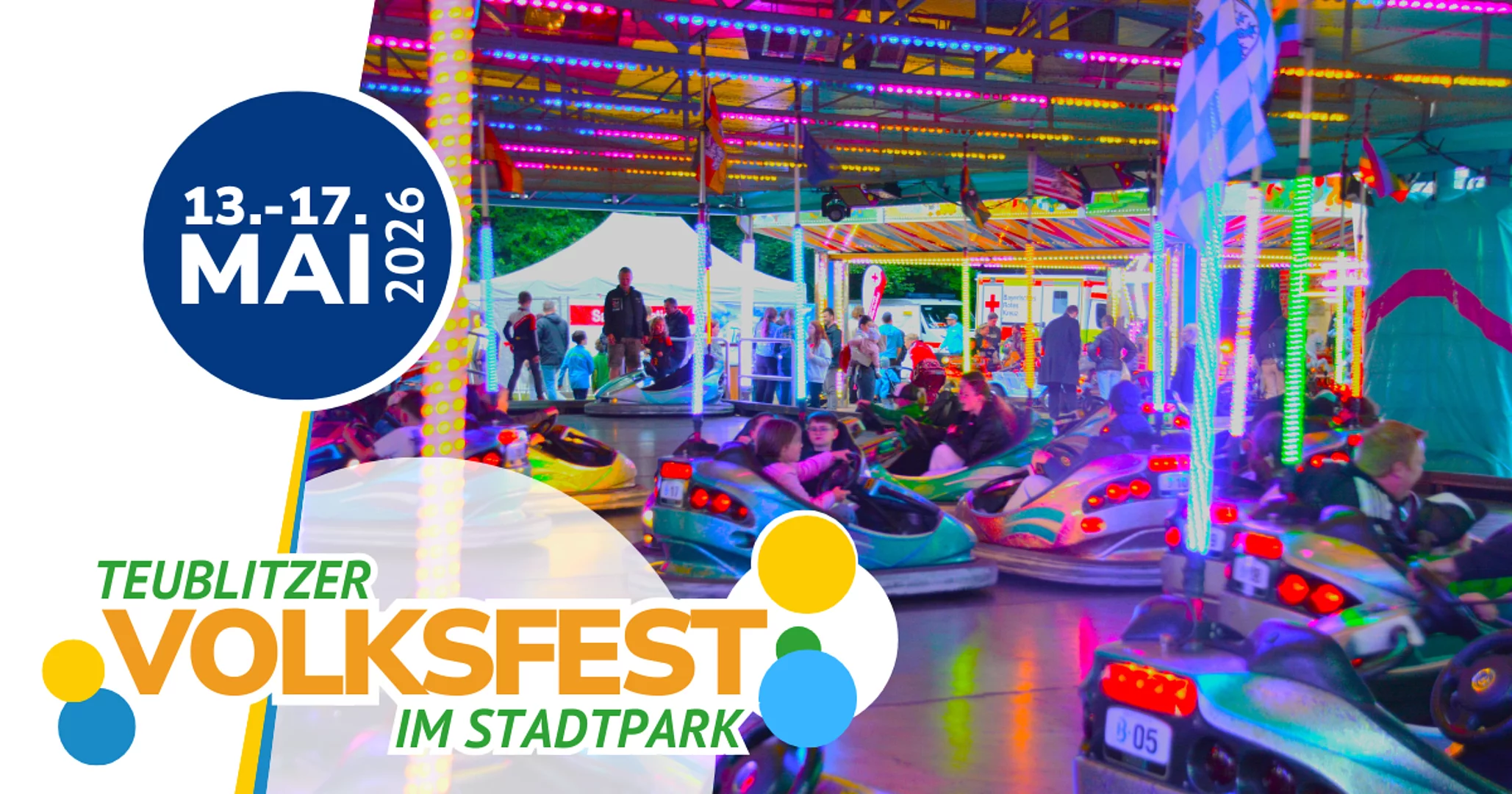 Vom 13. bis 17. Mai 2026 wird im Stadtpark wieder das Teublitzer Volksfest gefeiert. Fünf Tage lang erwartet die Besucherinnen und Besucher ein abwechslungsreiches Programm mit Musik, Festzeltbetrieb und einem modernen Vergnügungspark für die ganze Familie.