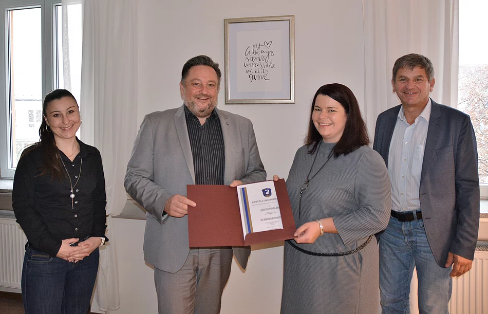 Der Beschluss des Stadtrats, Judith Kobler zur Standesbeamtin zu bestellen, erhält nun mit Überreichung der Urkunde am 26. November 2021 auch seine Wirksamkeit. Zum neuen Titel gratulierten Erster Bürgermeister Thomas Beer, Geschäftsleiter Franz Härtl und Standesamtsleiterin Stefanie Walter.
