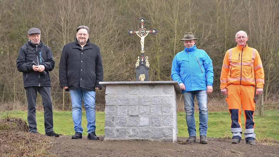 „Das Bewahren und die Pflege alter Traditionen und Denkmäler ist wichtig, um den kommenden Generationen das Oberpfälzer Kulturgut bestmöglich zu erhalten“, so Bürgermeister Thomas Beer bei einer Besichtigung mit Grundstückseigentümer Reinhard Erl, Bauhofleiter Peter Roidl und Werner Binder, Vertreter des Arbeitskreises für Flur- und Kleindenkmalforschung in der Oberpfalz e. V. (AFO), bei einem Ortstermin. Die heutige Position des Marterls wurde, so lauten Vermutungen, beim Ausbau der Jurastraße ausgewählt.