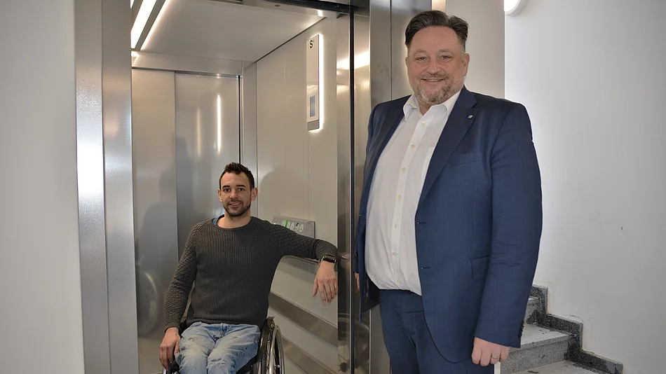 „Das Gröbste ist nun tatsächlich erledigt“, so Bürgermeister Thomas Beer im Rahmen einer ersten Testfahrt mit der neuen Aufzuganlage im Rathaus-Erweiterungsbau. „Insbesondere darüber, dass nun sämtliche Etagen des Rathauses ohne Hürden zu erreichen sind, freue ich mich besonders.“