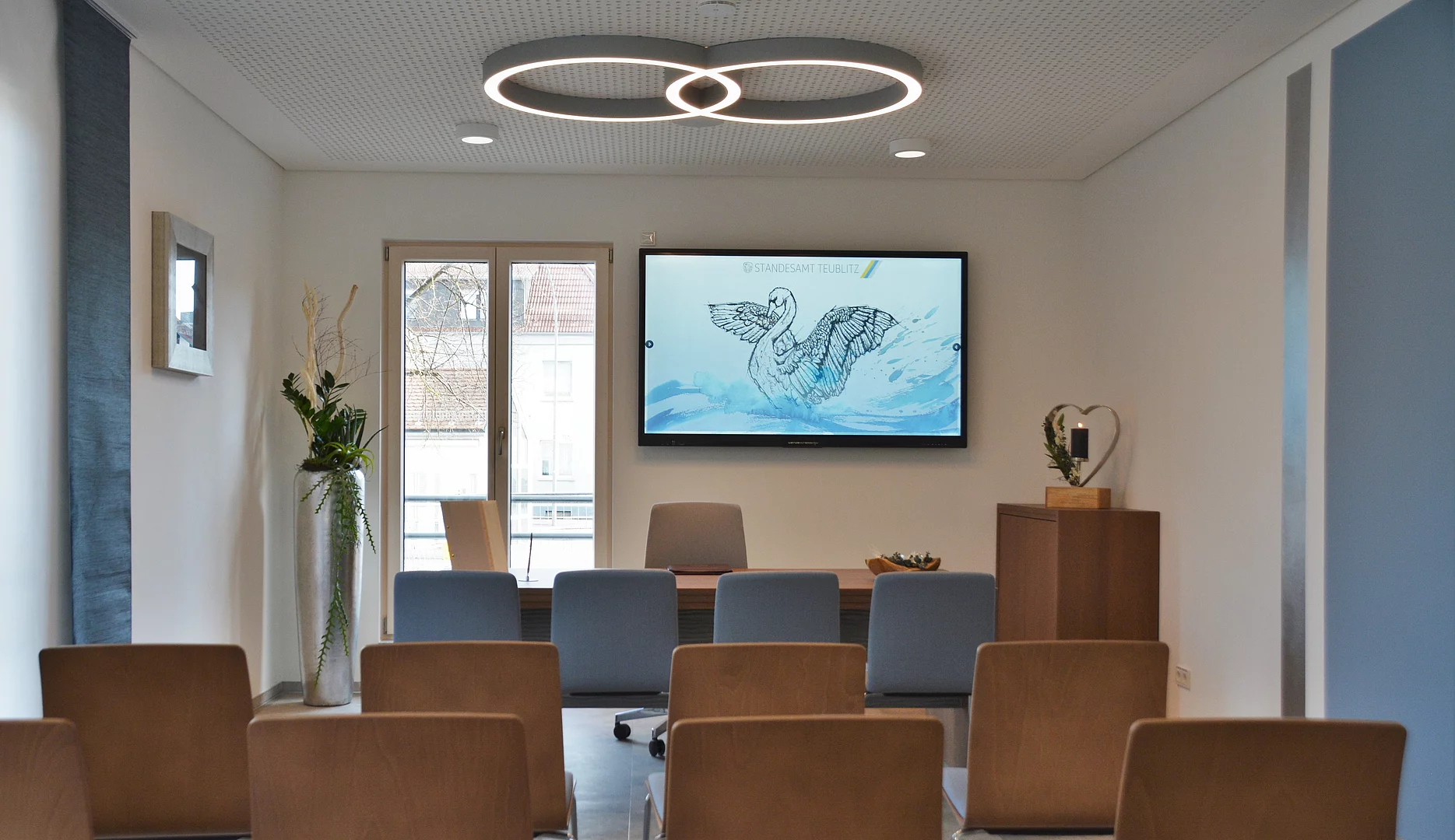 Man freue sich über ein modernes Verwaltungsgebäude, das barrierefrei ist und damit allen Teublitzer*innen zugänglich ist. Man freue sich auch über ordentliche sanitäre Anlagen, zwei Besprechungsräume mit modernster technischer Ausstattung und ein attraktives Trauzimmer mit Features, die nicht jede Stadt zu einer Trauung anbieten kann. Ganz besonders freute sich Bürgermeister Thomas Beer, dass jeder Beschäftigte im Team seinen eigenen, festen Arbeitsplatz hat. „Wir haben nun ein Rathaus im Zentrum von Teublitz, das mit dem gewohnten Anblick des Bestandsgebäudes zum einen den traditionellen Aspekten gerecht wird, aber mit dem Erweiterungsbau nun auch die Moderne unserer Stadt betont,“ bemerkte der Bürgermeister. Sein Dank – wie auch der des Stadtrates – galt allen Handwerker*innen und Firmen sowie den Planungsbüros.