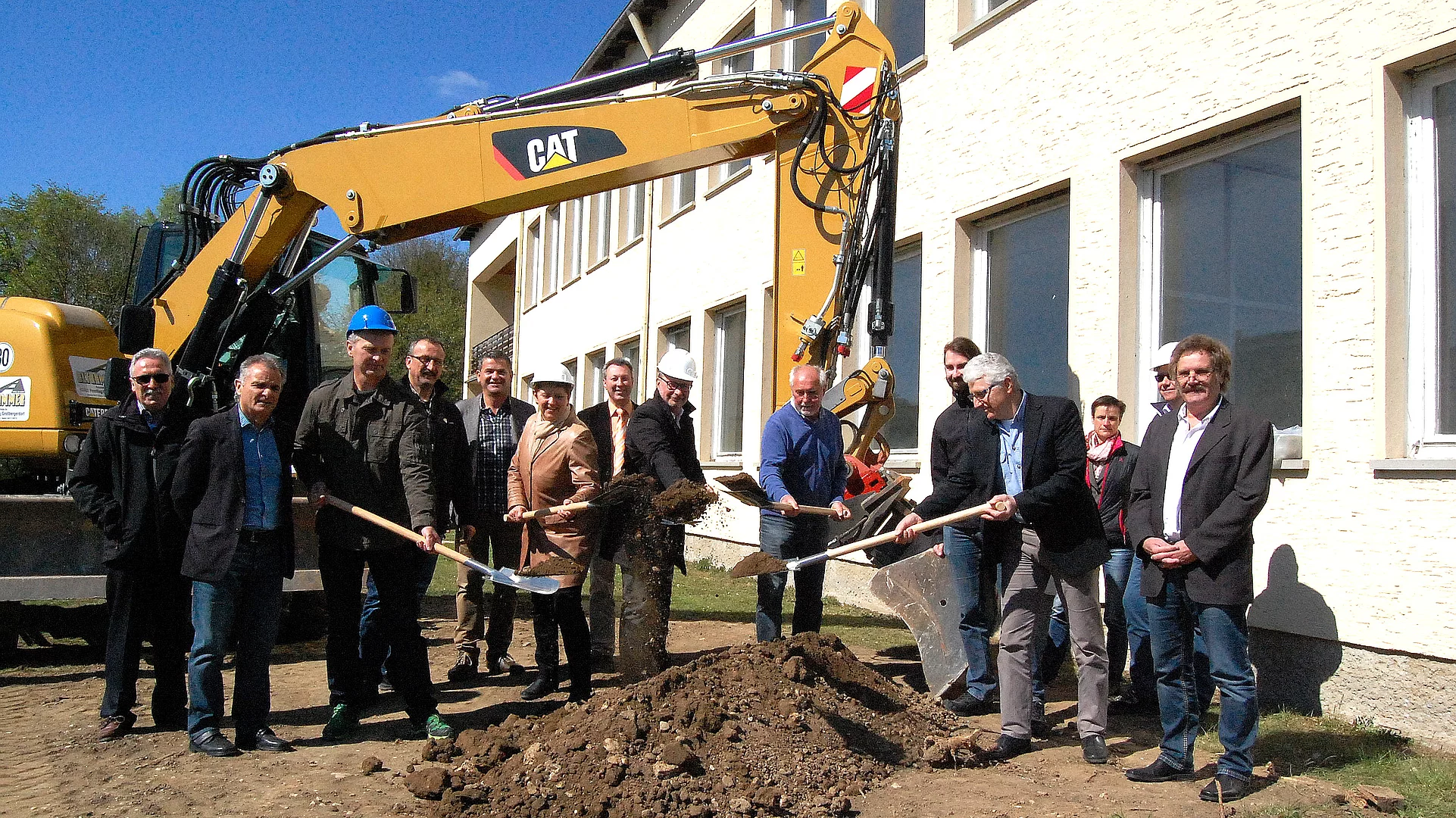 Zum Spatenstich begrüßte Bürgermeisterin Maria Steger den Architekten Alfred Popp und Vertreter der beteiligten Baufirmen. Sie freute sich, dass das Projekt Mehrgenerationenhaus nun endlich in Angriff genommen wird. Der Stadtrat hatte die Entwurfsplanung einstimmig genehmigt, nachdem die energetische Sanierung des ehemaligen Schulgebäudes im Mai 2016 in das KIP-Förderprogramm aufgenommen worden war. Die Arbeiten begannen mit dem Abbruch des Verbindungsganges zwischen Schulgebäude und Turnhalle bereits direkt nach den Osterfeiertagen. Nach einer Lockerung der Förderrichtlinien muss das Projekt bis zum 30. Juni 2019 abgeschlossen sein. Das Mehrgenerationenhaus soll aber bereits im Jahr 2018 seiner Bestimmung übergeben werden. Nach dem Abbruch des Verbindungsganges und der Turnhalle stehen bis dahin unter anderem noch eine vollständige energetische Sanierung, die Verlegung des barrierefreien Haupteingangs auf die Nordwestseite des Gebäudes und die Umsetzung eines neuen Raumkonzepts im Innenbereich an.