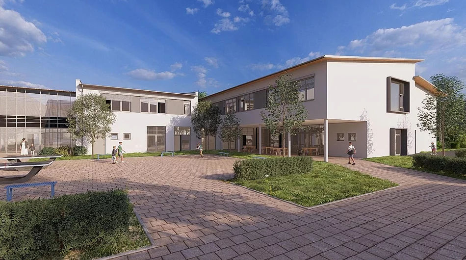 Der Erweiterungsbau umfasst einen zweigeschossigen Anbau mit rund 794 Quadratmetern zusätzlicher Nutzfläche sowie die Aufstockung des bestehenden eingeschossigen Ganztagstrakts. Im Erdgeschoss entstehen ein deutlich vergrößerter Speisesaal, eine erweiterte Schulküche sowie Technik- und Funktionsräume. Im Obergeschoss werden künftig moderne Aufenthalts- und Betreuungsräume zur Verfügung stehen. Ein neu geplanter Aufzug stellt die Barrierefreiheit aller Ebenen sicher.