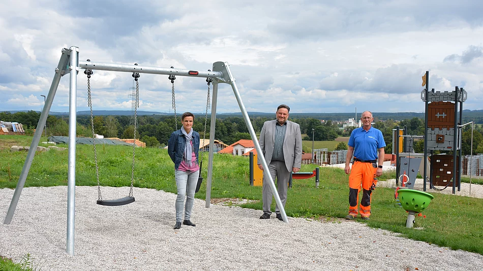 Bürgermeister Thomas Beer ließ sich bei einem Ortstermin die neuen Spielgeräte im Stadtgebiet zeigen. Im Baugebiet Pachnerstraße wurde der schon vorhandene Spielplatz auf Wunsch der Eltern noch um eine Doppelschaukel ergänzt.