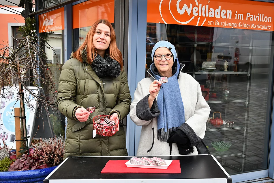 Die Fair Trade Steuerungsgruppe im Städtedreieck hat rückwirkend mit einem Stand auf dem Bauern- und Wochenmarkt darauf aufmerksam gemacht, fair gehandelte Waren zu verschenken und verteilte dazu kleine Aufmerksamkeiten „mit Herz“ an die Marktbesucher*innen.