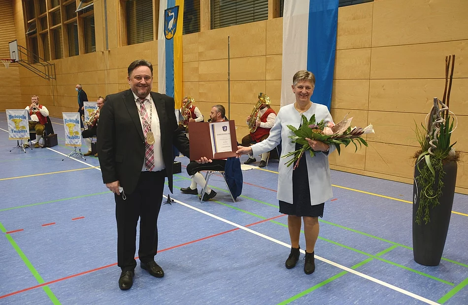 Dankesworte richtete anschließend Maria Steger an den Teublitzer Stadtrat für die einstimmige Ernennung zur „Altbürgermeisterin.“ Die Blaskapelle Teublitz umrahmte den Festabend in der Dreifachsporthalle musikalisch und spielte zum Abschluss die „Bayernhymne.“