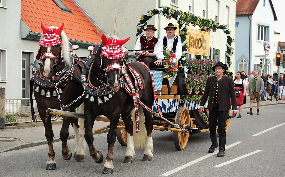 Nach dem halbstündigen Standkonzert ging es im Festzug durch die Straßen der Stadt in den Stadtpark. Voraus das Brauerei-Jacob-Pferdegespann, danach Festwirt Daniel Feuerer mit seinen Bedienungen, die Vertreter der Jacob-Brauerei mit Geschäftsführer Marcus Jacob, den drei Bürgermeistern Thomas Beer, Robert Wutz und Saskia Wilhelm-Dorn, dem stellvertretenden Landrat Jakob Scharf, Pfarrer Michael Hirmer, den Stadtratsmitgliedern und den vielen Teublitzer Vereinen mit ihren Fahnenabordnungen.