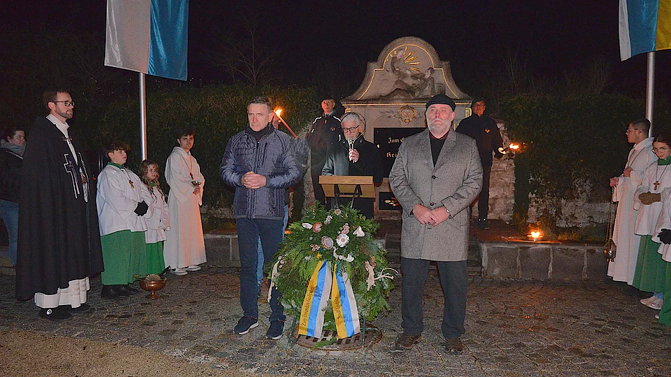 Als Zeichen für all das Geschehene und für den Frieden, legte Zweiter Bürgermeister Robert Wutz einen Kranz am Kriegerdenkmal nieder. Das Lied „vom guten Kameraden“ durch die Blaskapelle, verbunden mit drei Böllerschüssen, beendete die Gedenkfeier am Kriegerdenkmal. Unter den Klängen der Blaskapelle ging es dann im Fackel-Marsch zurück zum Kirchplatz, wo sich der Zug auflöste.