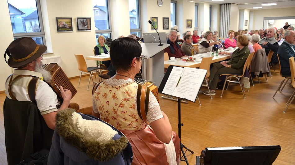 Für das leibliche Wohl hatten die Ehrenamtlichen des Seniorenbeirats für Kaffee, Kuchen, Stollen und Glühwein gesorgt. Zusätzlich wurde ein gemütliches, vorweihnachtliches Programm angeboten. Der besinnliche Teil des Nachmittags wurde gestaltet mit Weihnachtsgeschichten und -gedichten durch das Musik-Duo „Leonberger Bierfilzlmuse“.