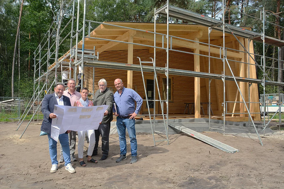 Die Bauarbeiten sind trotz der Ferienzeit in vollem Gange. Das Fundament wurde bereits durch die Firma Gebrüder Rupprecht gesetzt, während aktuell die Holzbauarbeiten von der Firma Hasl aus Bodenwöhr durchgeführt werden. Die Verantwortlichen des BRK Kreisverbands Schwandorf, darunter Kreisgeschäftsführer Josef Langenhan, zeigten sich von der Qualität und dem Voranschreiten der Arbeiten begeistert.