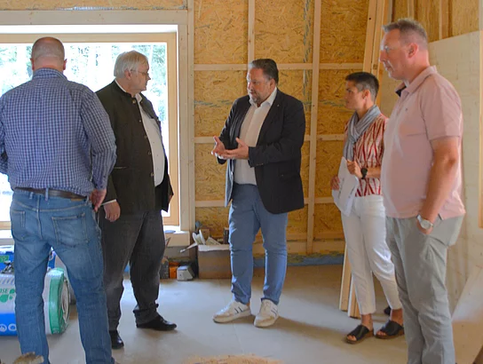 Die Bauarbeiten am neuen Waldkindergarten "Zwergenwald" in Teublitz schreiten weiter voran. Mitte August 2024 schauten Bürgermeister Thomas Beer und weitere Vertreter der Stadtverwaltung mit den Zuständigen des Bayerischen Roten Kreuz bei der Baustelle vorbei. Anfang Oktober soll die Kindergartengruppe einziehen.