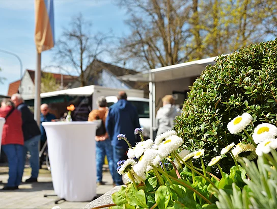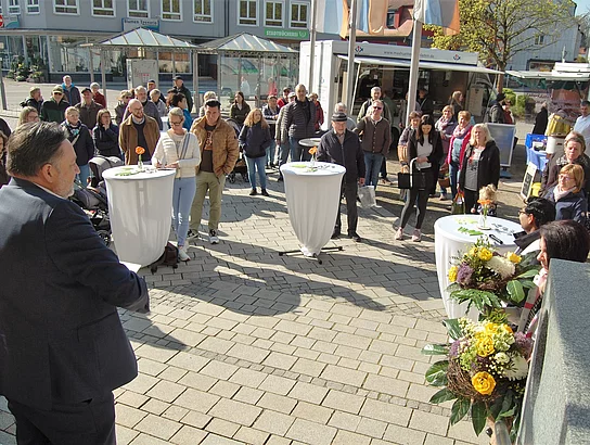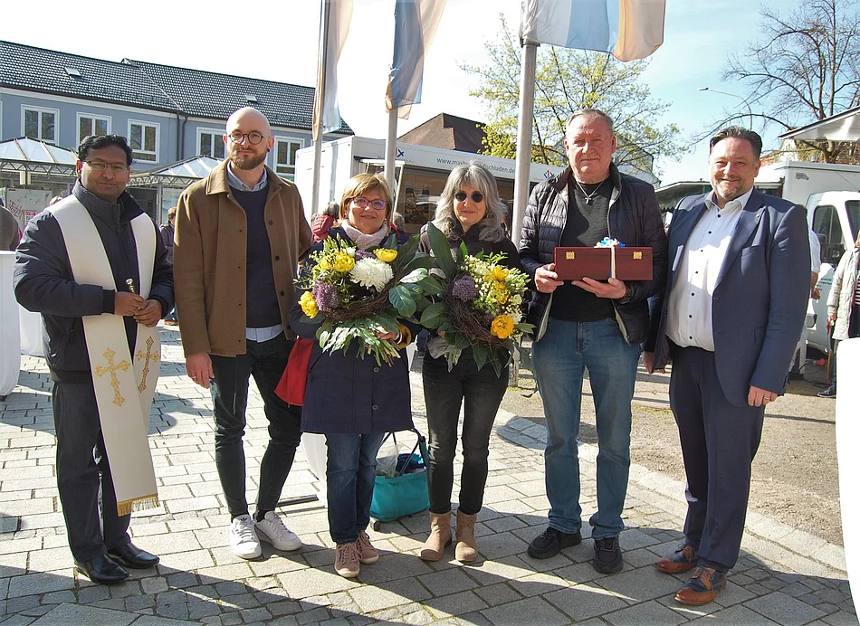 „Nachhaltigkeit, Regionalität und fair gehandelte Ware sind die drei Schlagwörter, die dem Wochenmarkt als Einkaufsadresse gerecht werden,“ so Bürgermeister Thomas Beer bei seiner Eröffnungsansprache. Wer bewusst einkaufen möchte, steht oft vor der Herausforderung, den richtigen Anbieter zu finden, der diesen Schlagworten nachkommt. Man habe eine engagierte und motivierte Gruppe von Marktbeschickern begeistern können, die den Wochenmarkt attraktiv für die Bevölkerung machen möchte. Dies wäre der Stadt Teublitz natürlich nicht gelungen ohne die unermüdliche Mithilfe von Maria Münz, Alexandra Zeins und Werner Förster. Beer überreichte den Damen einen Blumenstrauß und dem Herrn ein Weinpräsent als kleinen Dank für ihren Einsatz.