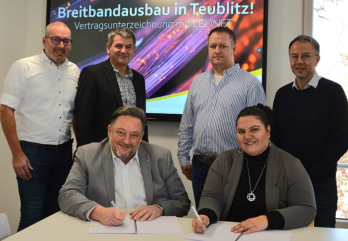 Das bayerische Telekommunikationsunternehmen LEONET wird die verbleibenden Weiler und Gehöfte rund um die Stadt Teublitz im Landkreis Schwandorf mit gigabitfähiger Glasfaser ausbauen. Dazu haben Mitte Februar 2024 Bürgermeister Thomas Beer und LEONET Kommunalbetreuerin Sandy Hutterer im Rathaus einen Kooperationsvertrag unterzeichnet. Mit dabei waren Breitbandpate Thomas Grundstein, Geschäftsleiter Franz Härtl, Breitbandberater Eduard Maier sowie Kay Roehle, Projektleiter Vertrieb der LEONET.