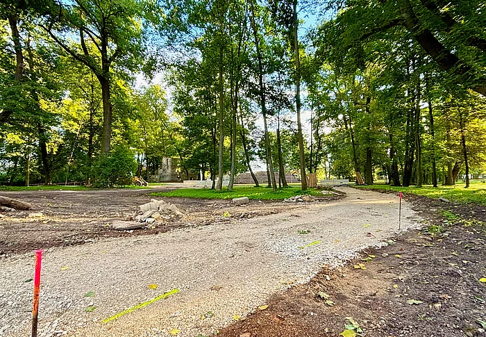 Die Neugestaltung des Stadtparks schreitet voran: Im Areal zwischen Schlossruine und Schulsportplatz haben die Bauarbeiten planmäßig am 1. September 2025 begonnen. Zunächst wurden alte Baumstümpfe samt Wurzelwerk entfernt sowie Erdreich abgetragen und laut Plan angeglichen. Zudem sind die neuen Wege bereits modelliert und mit einem Unterbau versehen.
