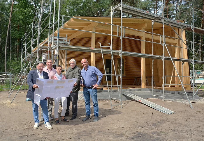 Die Bauarbeiten am neuen Waldkindergarten "Zwergenwald" in Teublitz schreiten weiter voran. Mitte August 2024 schauten Bürgermeister Thomas Beer und weitere Vertreter der Stadtverwaltung mit den Zuständigen des Bayerischen Roten Kreuz bei der Baustelle vorbei. Anfang Oktober soll die Kindergartengruppe einziehen.