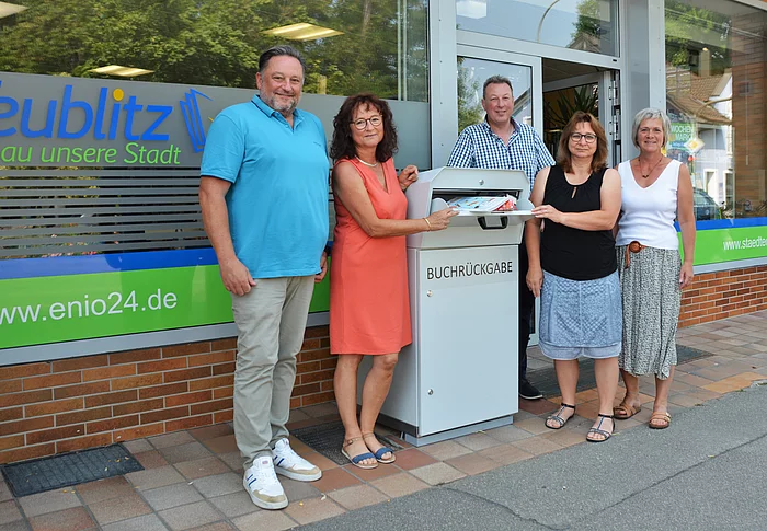 Seit Anfang Juli 2023 gibt es sie: Die neue Medienrückgabebox der Stadtbücherei Teublitz. Direkt vor der Eingangstür können damit ab sofort Medien auch dann zurückgegeben werden, wenn die Eingangstür verschlossen ist.